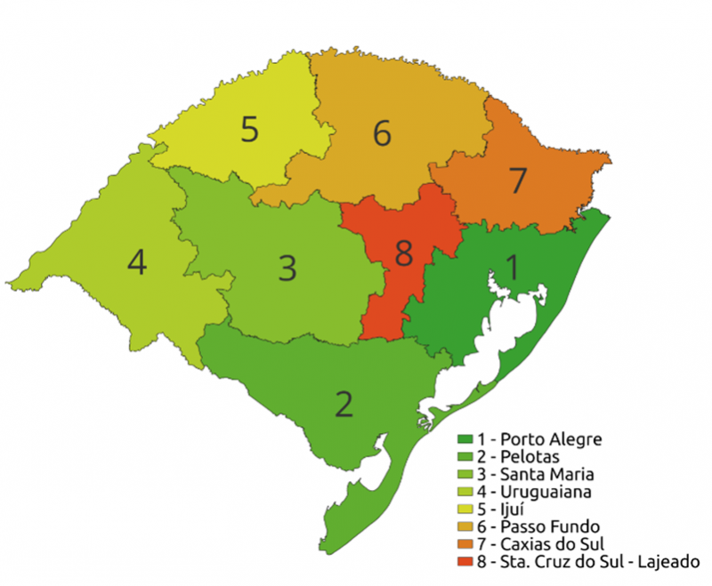 O profissional deverá indicar uma ou mais região geográfica de atuação conforme a imagem a seguir. A listagem dos municípios pertencentes a cada região pode ser conferida abaixo.