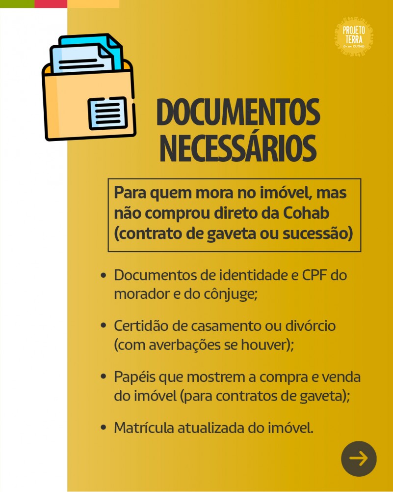 O Projeto Terra - Eu sou Cohab, foi desenvolvido pelo Poder Judiciário e teve a adesão da Sehab, visando a regularização fundiária dos imóveis que ainda estão registrados em nome da Cohab e que necessitam ser transferidos aos respectivos mutuários.